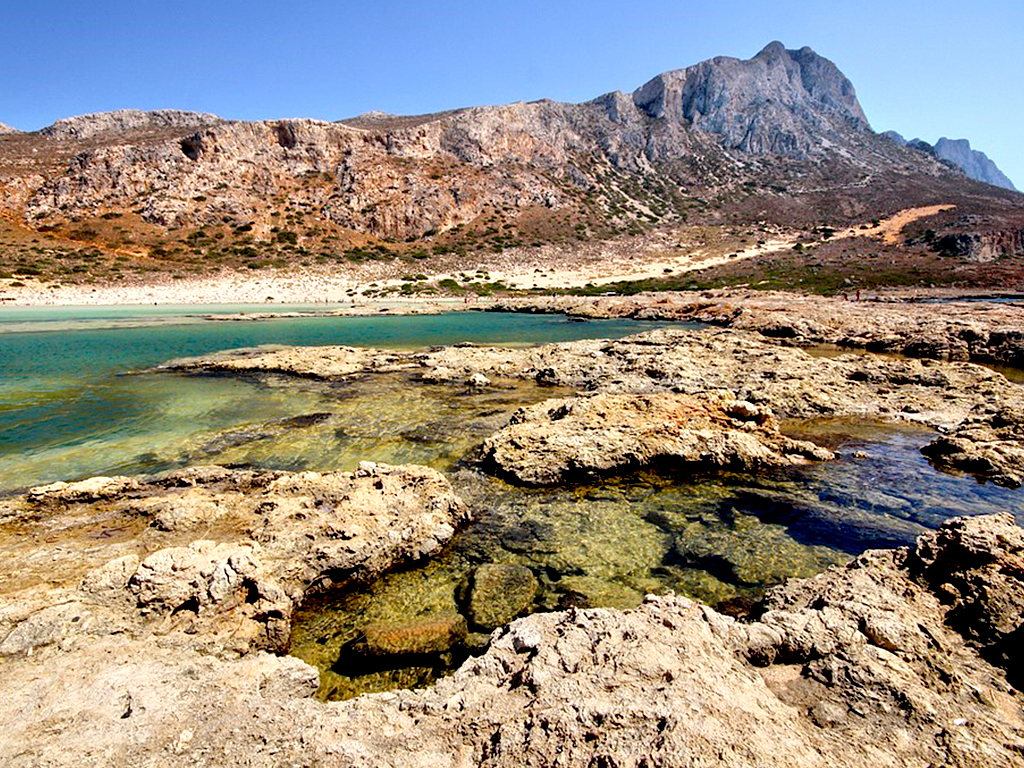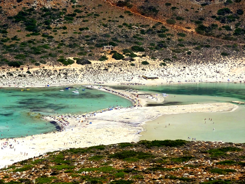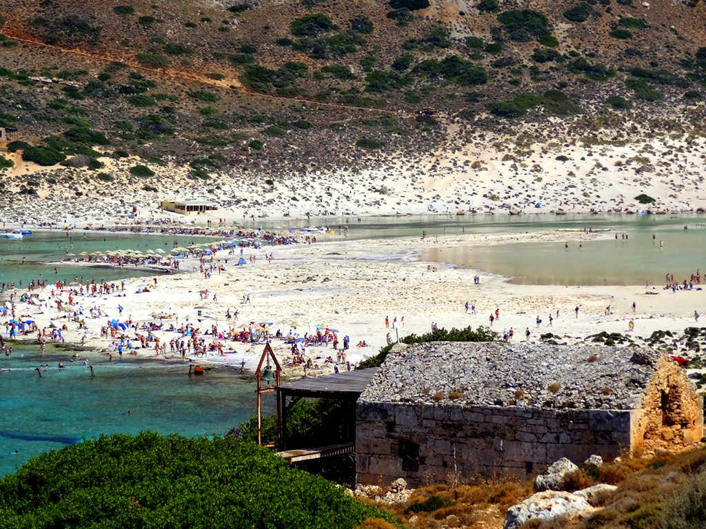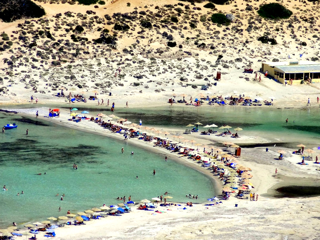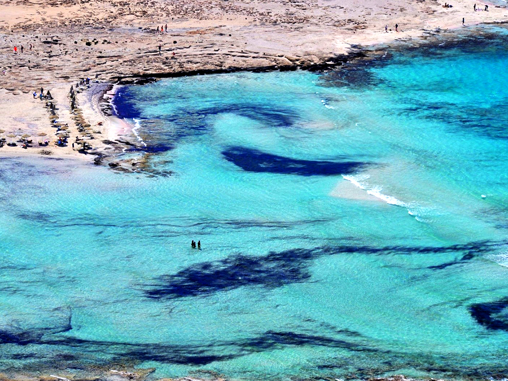 The lagoon of Balos has white sand and exotic white, vivid blue and turquoise waters. The sea is very shallow and warm, ideal for young children. In many places the sand has a lovely pinkish color, because of millions of crushed shells. Beyond the rocks at the boundaries of the lagoon, the water is deeper and colder, ideal for a snorkeling. The lagoon and the wider area, with rare species of flora and fauna, are protected under the Natura 2000 program. Eleonora falcons, shags and cormorants nest in the caves of the area. Moreover, the area is a shelter for the protected monk seal and the sea turtle caretta caretta. Despite the protection, a primitive café and umbrellas have appeared on the beach in recent years. You can buy water from there and from the bars of the ferries.