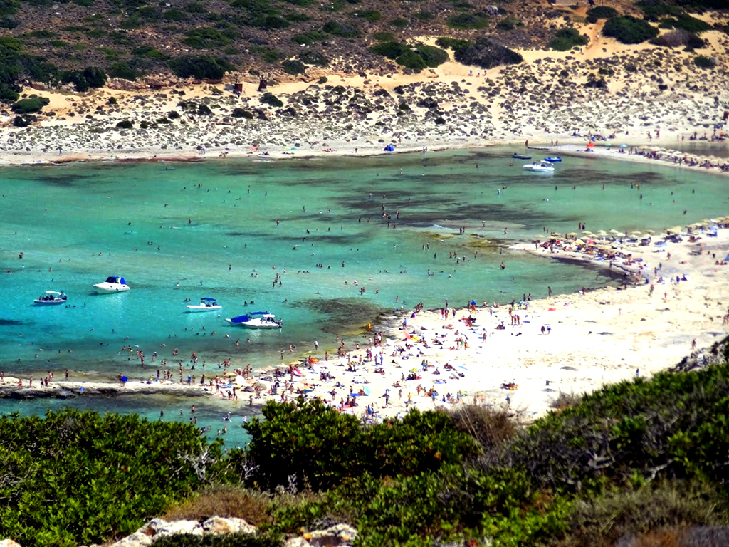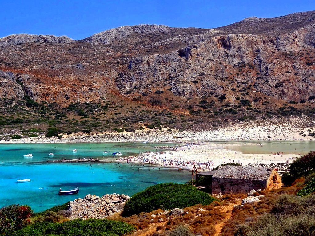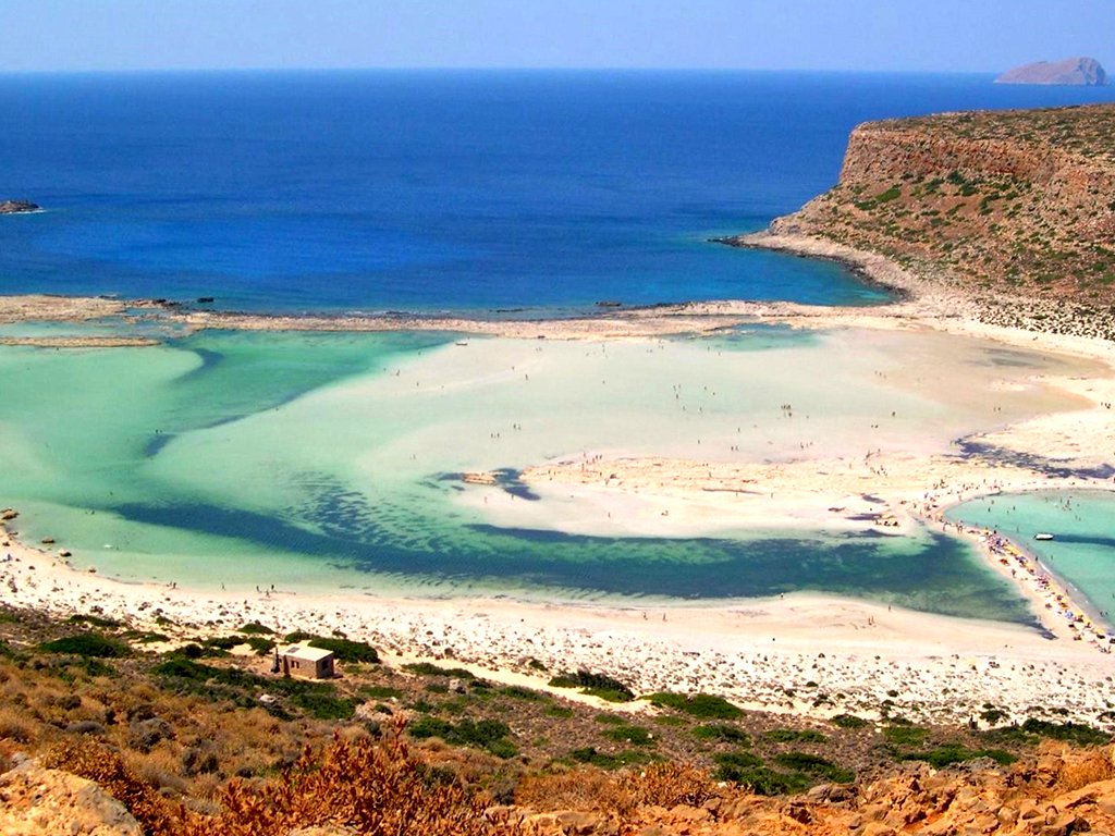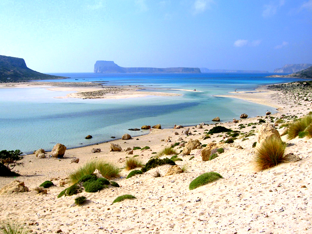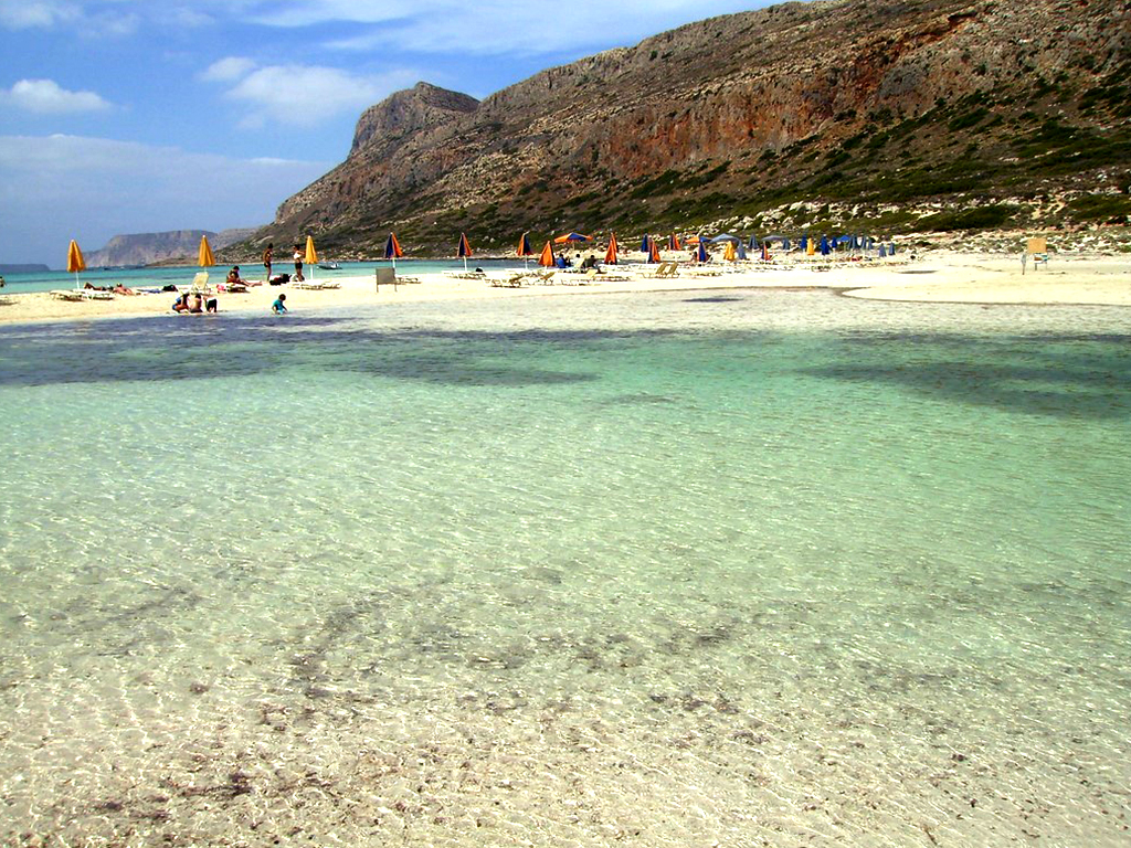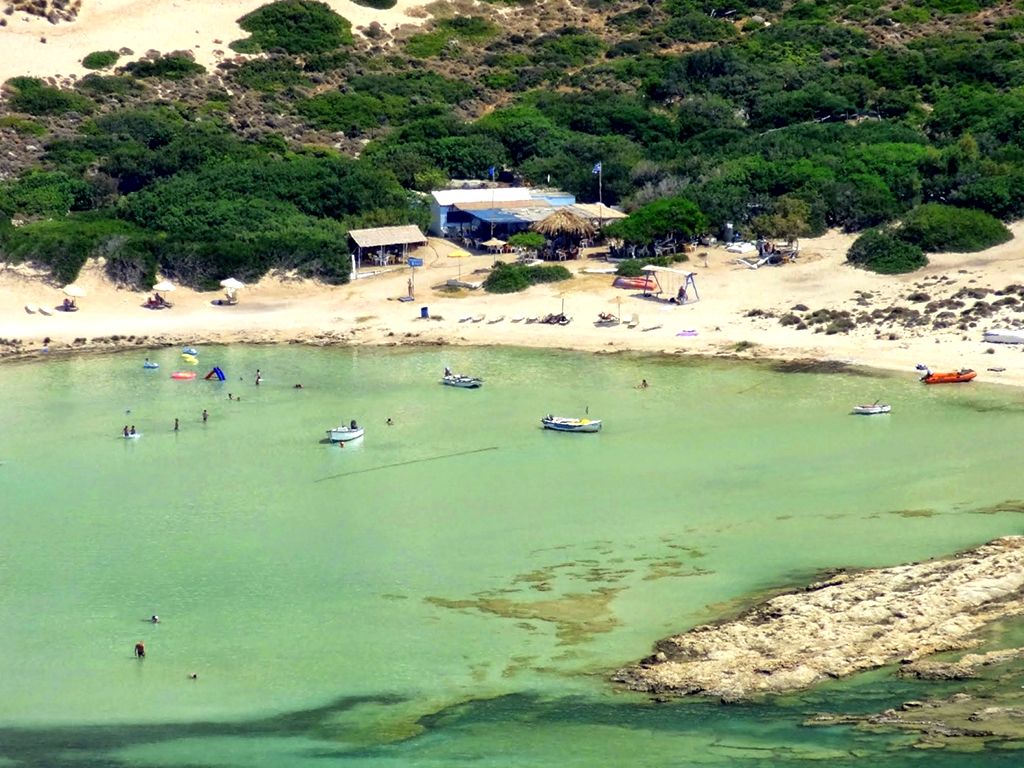 The lagoon of Balos has white sand and exotic white, vivid blue and turquoise waters. The sea is very shallow and warm, ideal for young children. In many places the sand has a lovely pinkish color, because of millions of crushed shells. Beyond the rocks at the boundaries of the lagoon, the water is deeper and colder, ideal for a snorkeling. The lagoon and the wider area, with rare species of flora and fauna, are protected under the Natura 2000 program. Eleonora falcons, shags and cormorants nest in the caves of the area. Moreover, the area is a shelter for the protected monk seal and the sea turtle caretta caretta. Despite the protection, a primitive café and umbrellas have appeared on the beach in recent years. You can buy water from there and from the bars of the ferries.