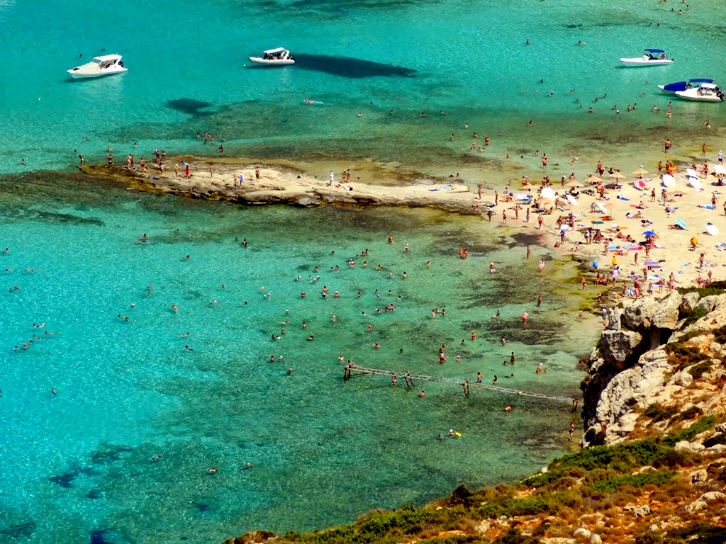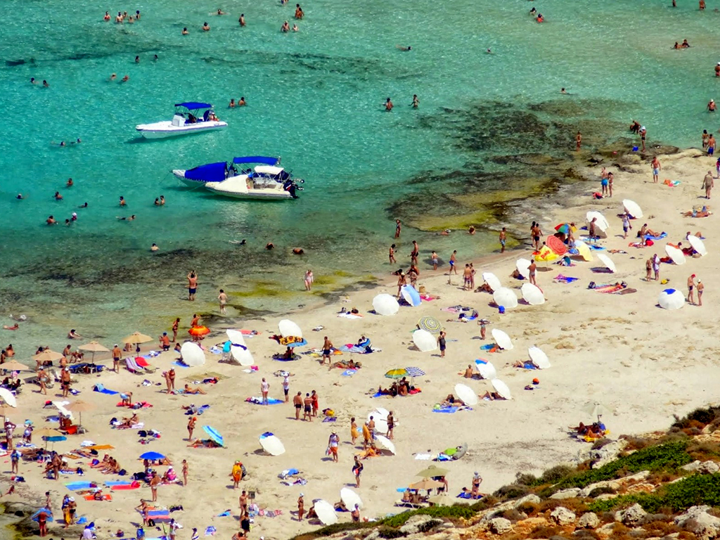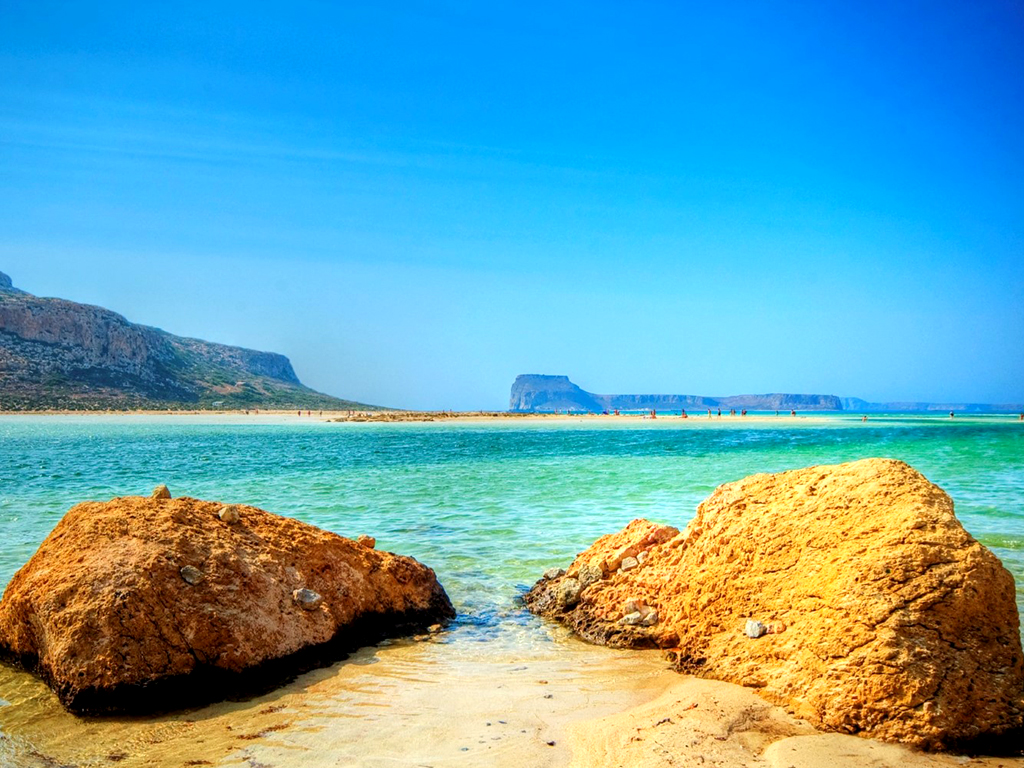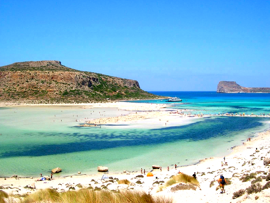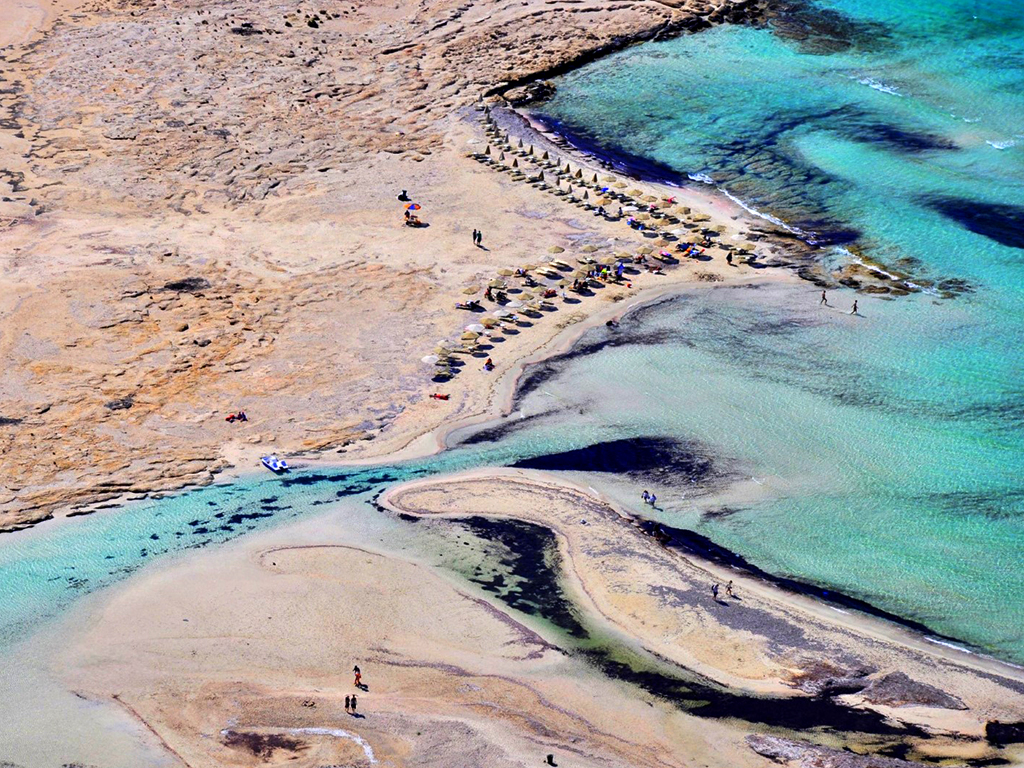 The lagoon of Balos has white sand and exotic white, vivid blue and turquoise waters. The sea is very shallow and warm, ideal for young children. In many places the sand has a lovely pinkish color, because of millions of crushed shells. Beyond the rocks at the boundaries of the lagoon, the water is deeper and colder, ideal for a snorkeling. The lagoon and the wider area, with rare species of flora and fauna, are protected under the Natura 2000 program. Eleonora falcons, shags and cormorants nest in the caves of the area. Moreover, the area is a shelter for the protected monk seal and the sea turtle caretta caretta. Despite the protection, a primitive café and umbrellas have appeared on the beach in recent years. You can buy water from there and from the bars of the ferries.