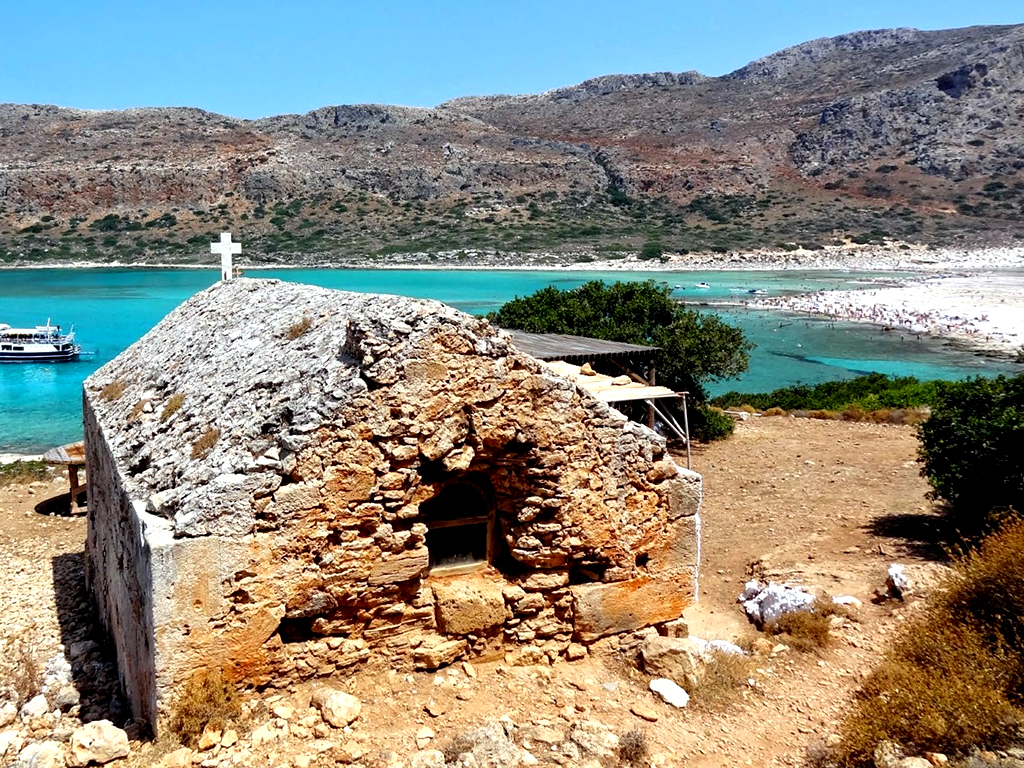 However, the most exciting way to access Balos is by trekking for three hours from Kaliviani, crossing the rough and dry landscape Gramvousa. Do not forget to wear a hat and have plenty of water with you. If you come in Balos, you can visit the small chapel of Saint George located in Tigani. At Tigani, you could also visit the large cavern where many women and children were slaughtered during the Turkish massacres in 1825. The Christians were hiding in the cave, but the Turks soon discovered their shelter, thus killed them all. There is a commemorative sign at the site where the bones of the victims were found. Also, north of Balos, in Cape Korykon there are remains of the small Roman town of Agnio with the temple of Apollo. Today, there is the picturesque chapel of Agios Sostis.